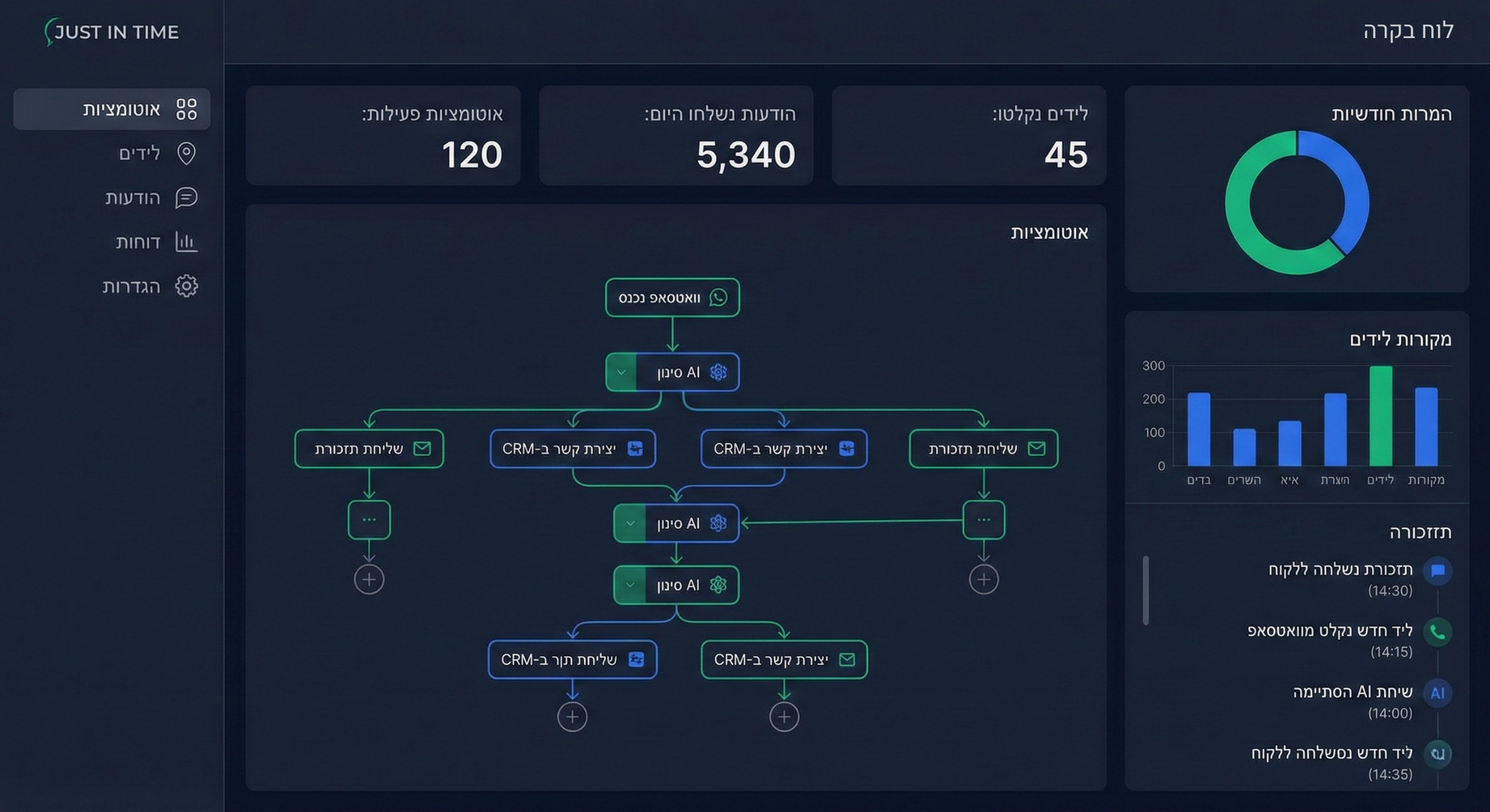 אוטומציות חכמות וסוכני AI שמטפלים בלידים, קובעים תורים וסוגרים עסקאות בזמן אמת. פתרונות מותאמים לכל תעשייה.